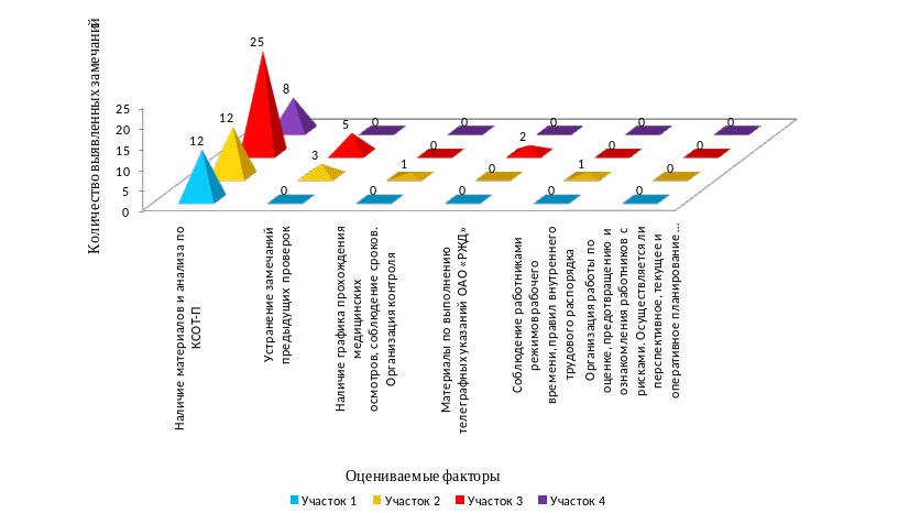 По результатам сводного анализа видно, что наибольшее количество замечаний в 2016 году было выявлено на третьем производственном участке. Это можно объяснить тем, что третий производственный участок самый большой по протяженности, по сравнению с первым, вторым и четвертым. В этот участок входит больше станций, разъездов, перегонов и оборудования. Именно поэтому на третьем производственном участке необходимо усилить контроль за состоянием охраны труда.