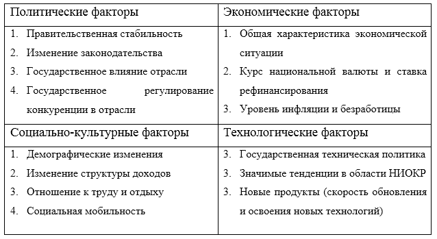 К факторам макросреды обычно относят: экономическое состояние страны; политико-правовой аспект; социальное и культурное окружение; научно-техническое и технологическое развитие общества.