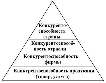 Вклад в понятие «конкурентоспособность» зависит от объекта ее оценки. Объектами служат продукция, фирма, отрасль, страна. Исходя из указанных объектов, конкурентоспособность можно рассматривать на четырех уровнях, которые представляют «пирамиду конкурентоспособности» (рисунок 2).