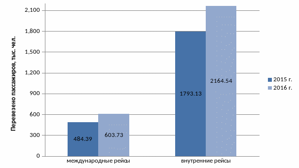 Рассматривая количество перевезенных пассажиров за первые три месяца 2015– 2016 годов, также можно отметить прирост 21,5 % (227 756 чел. в 2015 г., 276 827 чел. в 2016 г.). За первый квартал 2016 год на международных рейсах было перевезено 60 373 пассажира, на внутренних – 216 454 пассажира, пассажиропоток по сравнению с первым кварталом 2015 года увеличился на 24,64 % и 20,71 % соответственно, что демонстрирует рисунок 8.