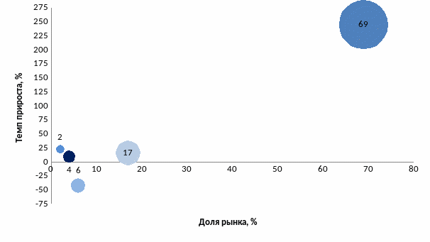 Построим карту конкурентов (рисунок 10), исходя из рассчитанных темпов прироста и доли рынка.