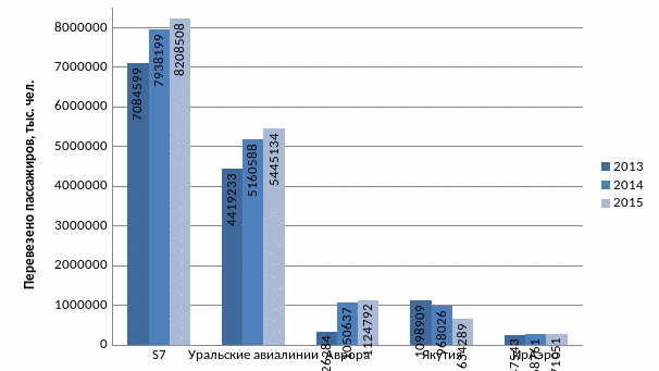 Рисунок демонстрирует, что тенденцию к увеличению количества перевезенных пассажиров показывают все авиакомпании, за исключением «Якутия». Уменьшение количества перевезенных пассажиров авиакомпанией «Якутия» составило 42,3 % в сравнении 2015 и 2013 годов. Остальные авиакомпании показали же рост пассажиропотока: «S7» на 15,9 %; «Уральские авиалинии» на 23,2 %; «Аврора» в 3,4 раза; «ИрАэро» на 9,5 %. Стоит отметить, что в целом темпы роста рынка неплохие. Рынок поделен между наиболее сильными конкурентами, хотя им стоит опасаться появления потенциальных конкурентов, которые пока занимают малую долю рынка.