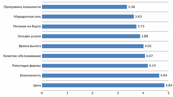 Рисунок показывает, что наиболее важными параметрами для потребителей является цена (4,84), безопасность полета (4,64), репутация фирмы, ее надежность (4,19). Наименее важным параметром является наличие программ лояльности.