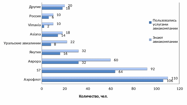 Как видно из рисунка, наибольшую известность имеет авиакомпания «Аэрофлот», ее знают 98 % опрошенных. Компанию «S7» вспомнили 82,2 % опрошенных, а 57,2 % пользовались ее услугами. Авиакомпания «Якутия» 28,6 % и 14,3 %; «Уральские авиалинии» – 19,6 % и 7,2 % соответственно. Под другими авиакомпаниями называли в основном зарубежные авиакомпании или российские, значения которых было слишком мало для сравнения. Авиакомпанию «Аврору» знают 53,6 % опрошенных, а 28,6 % в открытом вопросе упомянули, что пользовались ее услугами. При этом, на закрытый вопрос «Пользовались ли Вы услугами авиакомпании «Аврора»?» 54,7 % опрошенных ответили «Да», что превышает значение в открытом опросе почти в 2 раза. 67 % опрошенных были удовлетворены предоставленными услугами авиакомпанией «Аврора». Также стоит отметить, что «Аврора» является дочерним предприятием «Аэрофлот», при этом некоторые опрошенные, пользуясь услугами авиакомпании «Аврора», были уверены, что рейс выполняет «Аэрофлот», а об «Аврора» никогда и не слышали. Являясь дочерним предприятие Группы «Аэрофлот», авиакомпания имеет ряд преимуществ, хотя с другой стороны, ей сложно позиционировать себя как самостоятельное предприятие, чтобы при выборе авиакомпании потребители знали о самостоятельной авиакомпании и выбирали ее, если нет приписки «Аэрофлот».