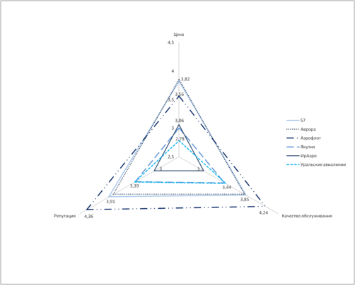 Рисунок показывает, что по качеству обслуживания и репутации фирмы лидирует «Аэрофлот» (4,24), но если рассматривать только прямых конкурентов «Аврора», что наивысшие оценки по данным параметрам имеет «S7» («цена» – 3,82, «качество» – 3,85, «репутация» – 3,91), уступая «Аврора» («цена» – 3,85, «качество» – 3,82, «репутация» – 3,82) в цене. Наименьшие оценки по трем параметрам получили «Якутия» («цена» – 3, «качество» – 3,42, «репутация» – 3,38) и «ИрАэро» (3,06; 3; 3 соответсвенно).
