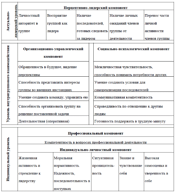 Анализируя различные подходы по изучению лидерских качеств, хотелось бы отметить трехуровневую модель О.В. Евтихова, представленную в таблице 5, приведенную в одной из его монографий [1, с.44].