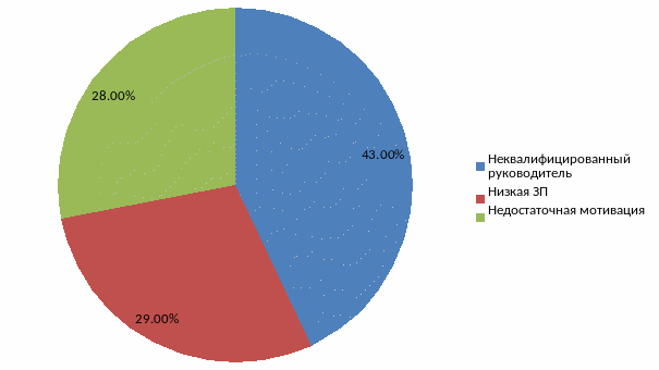 Был проведен анализ причин ухода персонала из техникума. Глядя на рисунок 6 видно, что основная причина ухода работников – неквалифицированный руководитель (43 %), так же сотрудники увольняются по причине низкой заработной платы (29 %) и недостаточной мотивации (28 %). К недостаточной мотивации сотрудники отнесли: отсутствие перспектив роста, нет желания работать, а также они не чувствуют себя значимыми.