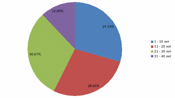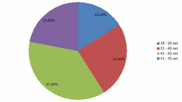 На диаграмме на рисунке 2 выявлены 3 основных сегмента: 37 % персонала в возрасте от 41 до 50 лет, 25 % персонала в возрасте от 31 – 40 лет и 22 % персонала в возрасте от 51 – 70 лет. Судя по этим данным, в «Хабаровском дорожно-строительном техникуме» немного специалистов молодого возраста, в большинстве своем это взрослые и пожилые люди, что является нормальным для техникума.