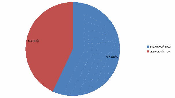 По данным диаграммы видно, что в техникуме больше сотрудников мужского пола (57 %), чем женского (43 %). Большинство работников мужского пола «Хабаровского дорожно-строительного техникума» занимают такие должности, как слесари, механики и тому подобное. Работники женского пола занимаются преподаванием и составляют большую часть руководящих должностей.