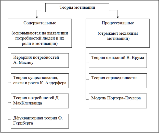В современных исследованиях различные теории мотивации разделяются на две категории: содержательные (теория иерархии Абрахама Маслоу, теория существования, связи и роста К. Альдерфера, теория приобретенных потребностей Дэвида МакКлелланда, теория двух факторов Фредерика Герцберга) и процессуальные (теория ожиданий, теория справедливости и модель мотивации Портера-Лоулера).