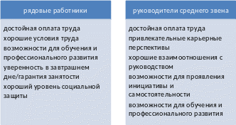 Многочисленные опросы работников различных российских организаций позволили составить перечень наиболее часто упоминаемых потребностей, стремление к удовлетворению которых не только определяет выбор места работы, но и формирует готовность работать с высокой отдачей. Это следующие потребности: