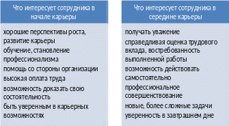 6. Динамичность мотивации. Значимость определенного мотива и его место в иерархии может меняться не только со временем, но и от ситуации к ситуации. Сам набор потребностей может меняться в зависимости от профессиональной группы, внешних условий (рыночные условия, конкуренция, государственное регулирование), этапа карьеры, возраста и даже семейного положения. Сравним потребности работников в начале и в середине карьеры [23, с.33] (см. рисунок 8).