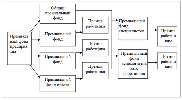 В предлагаемой системе запланированный фонд заработной платы распределяется в коллективе в соответствии с должностными окладами работников. Премиальный фонд предприятия, который образуется в результате увеличения производительности труда, распределяется между коллективами и работниками вышеуказанного предприятия в соответствии с эффективностью труда каждого из них по нижеуказанной схеме (рис. 12).