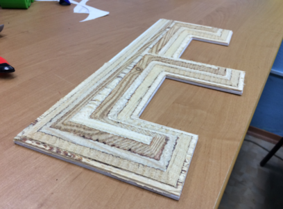 Крыша для макета, Е-образной формы, в сечении треугольник. Гравировка фанеры толщиной 12 мм. Размер модели 320 мм - 410 мм - 11 мм. Гравировка одной фрезой концевая 6 мм. Управляющие программы, объеденные в одну: черновая, чистовая и резка по контуру. На рисунке 2.31 показана крыша, вырезанная на фрезерном станке.