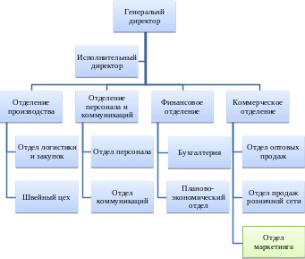 Согласно имеющейся организационной схеме, штатная единица маркетолог будет введен в коммерческое отделение так, как показано на рисунке.