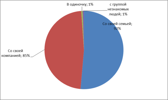 Из анализа видно, люди любят отдыхать со своей семьей, 92% опрошенных ответили так, 85% со своей компанией, и по 1% в одиночку и с группой незнакомых людей (Рис 7)