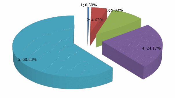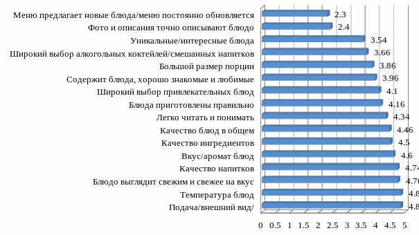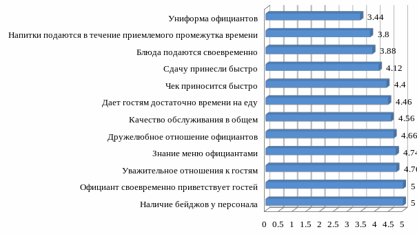 Средний уровень удовлетворенности услугами кафе составляет 4,23 ((4,068+4,401)/2 = 4,23) по пятибалльной системе, что говорит о достаточно эффективной его работе и в первую очередь о качественной работе самого персонала и руководства с персоналом.