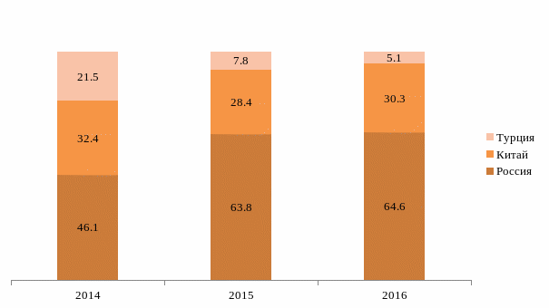 Анализ географии размещения предприятий – поставщиков показал, что основная часть партнеров приходится на отечественные предприятия, частично завозится товар из Турции и Китая. Изменение доли объемов закупок у отечественных и зарубежных поставщиков представлено на рисунке 5.