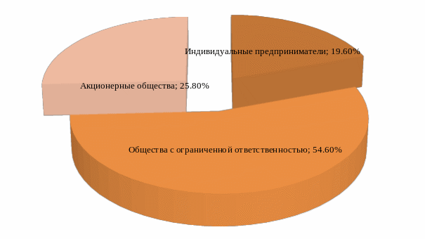 По организационно-правовой форме поставщики представлены как юридическими лицами, так и физическими лицами, зарегистрированными как индивидуальные предприниматели. Среди юридических лиц присутствуют: общества с ограниченной ответственностью, акционерные общества. По данным за 2016 год соотношение между юридическими и физическими лицами-предпринимателями составило 81,4 % к 19,6 %. Среди юридических лиц ведущее место занимают акционерные общества и общества с ограниченной ответственностью. Графически соотношение поставщиков по организационно-правовой форме представлено на рисунке 6.