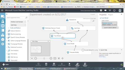 Для модуля обучения модели был указан столбец train_level, содержащий признак уровня подготовки пользователя. Для модуля разделения данных был указан параметр 0,75 (данные разбиваются на две неравные части: 75% и 25%, большая часть будет использована для обучения модели, а меньшая – для проверки ее работы).