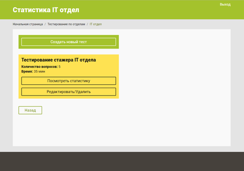 На данной странице доступна информация о существующих тестах для данного отдела. Также здесь можно создать новый тест, отредактировать или удалить существующий тест при наличии необходимых прав на это действие. Права на выполнения действий распределяются главным администратором системы тестирования в программно-административной части приложения. Создание нового теста, редактирование или удаление существующего теста происходит через программно-аппаратную часть приложения.