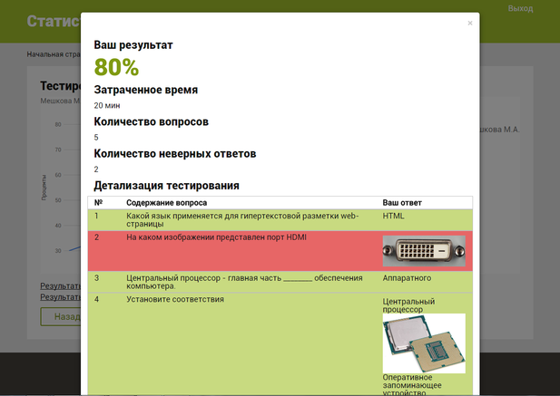 В результатах тестирования (рисунок 38) отображается результат пройденного тестирования, время, затраченное на прохождение теста, количество вопросов тестирования, количество неверных ответов. Также на данной странице представлена детализация тестирования с указанием ответов пользователя, среди которых выделяются особым образом верные ответы и неверные ответы.
