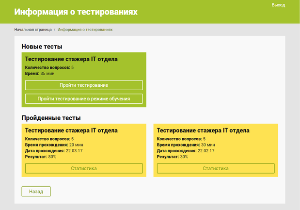 В информации о пройденных тестированиях предоставлены следующие данные:
