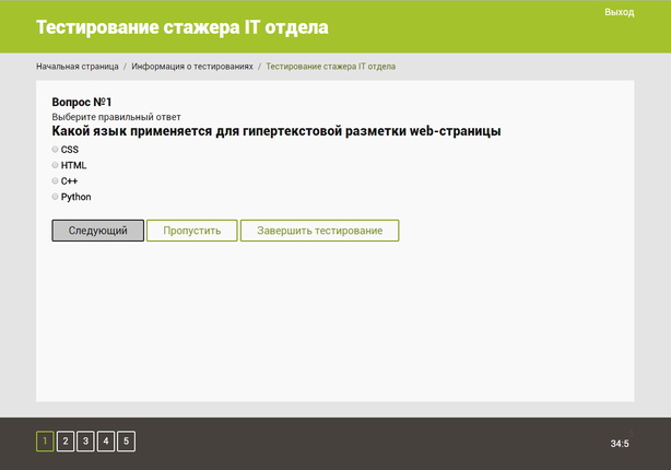 Исходя из составленной в ходе выпускной квалификационной работы методологии, спроектирован интерфейс системы тестирования. Далее будут рассмотрены основные положения проектирования интерфейса, описанного в методологии и их применение в данном приложении.