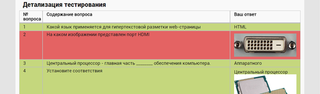 Цветовые акценты также используются в детализации тестирования для обозначения верных и неверных ответов на вопросы. Вопросы, на которые был дан верный ответ, обозначаются зеленым, вопросы, ответ на которые был неверен – красным (рисунок 62).