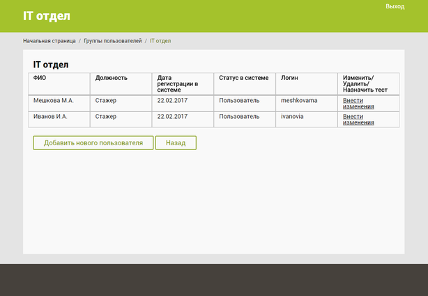 На данной странице доступна информация о каждом пользователе: ФИО, должность, дата регистрации в системе, статус в системе, логин. При нажатии на кнопку «Добавить нового пользователя» или на ссылку «Внести изменения» происходит переход в программно-административную часть приложения, где можно выполнить данные операции.