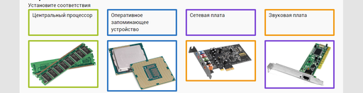В вопросе на соответствие (рисунок 59) также используются цветные рамки. Но в данном случае используются рамки разных цветов для обозначения разных вариантов комбинаций ответа на вопрос. Цвета рамок подобраны таким образом, чтобы они сочетались с цветами интерфейса, были различимы между собой и, чтобы не происходило явное выделение отдельного цвета среди прочих.