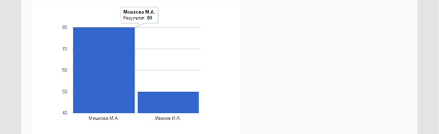 На данной странице представлен график в виде столбчатой диаграммы, отражающей результаты тестирования группы тестируемых. С помощью диаграммы можно визуально сравнить результаты тестирования группы, выделить лучших и худших участников. При наведении курсора мыши на столбец диаграммы появляется дополнительная информация (рисунок 47).