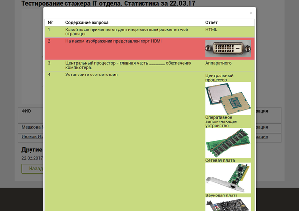 Под диаграммой (рисунок 46) расположена таблица с более подробным отчетом о тестировании с указанием ФИО тестируемого, результатом тестирования, затраченном времени, количеством неверных ответов и отчетом детализации, при нажатии на который открывается информация об ответах испытуемого с указанием верных и неверных ответов (рисунок 48). При нажатии на фамилию тестируемого можно осуществить переход на страницу с его персональной статистикой (рисунок 39). Также на странице реализован переход на статистику тестирования за другие даты.