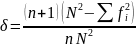 Под дискриминативностью тестовых заданий понимают способность системы тестирования разграничивать уровень знаний тестируемых. В процессе разработки тестовых заданий необходимо добиться того, чтобы задания как можно тоньше измеряли необходимые показатели тестируемых. В том случае, если в результате тестирования у тестируемых выявляются практически одинаковые результаты, то это говорит о том, что тестовые задания слишком грубо измеряют показатели тестируемых. Можно сделать вывод о том, что чем разнообразнее результаты тестирования, тем больше разрешающая способность у теста. Таким образом, дифференцируемость результатов теста является его дискриминативностью, которая измеряется показателем дельта Фергюссона и вычисляется по формуле (2):