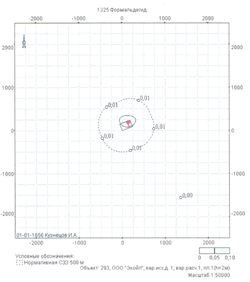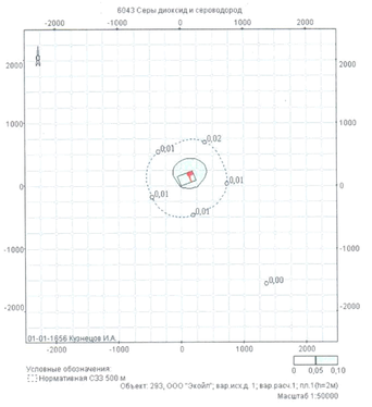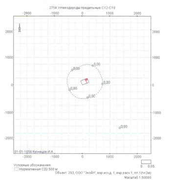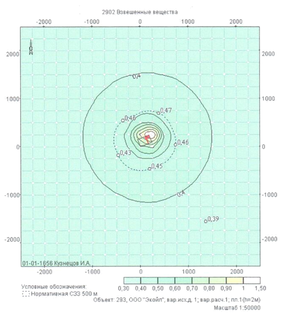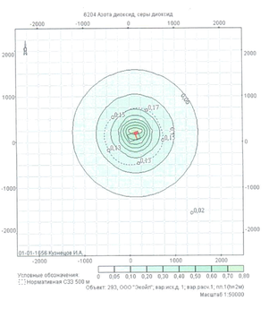 Построив карты распространения вредных веществ в атмосфере, при помощи программного обеспечения «УПРЗА Эколог» совмещаются с картой местности на которой обведена нормативная зона выбросов (Рисунок 24).