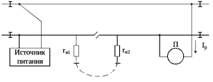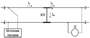 Шунтовой режим работы рельсовой цепи возникает при вступлении подвижного состава на контролируемую рельсовую цепь участка железнодорожного пути. Соответствующая электрическая цепь изображена на рисунке (1.6). При анализе рисунка следует учесть пренебрежимо малое сопротивление колесных пар.