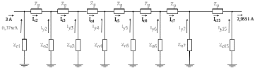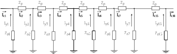 Рисунок 1.8 – Электрическая схема замещения заземляемых конструкций. Конструкции присоединены к рельсу двухниточной рельсовой цепи. Длина пролета 65 м.