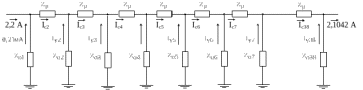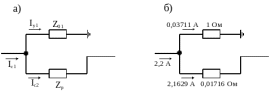 Электрическая схема замещения заземленной опоры и соответствующая схема распределения сигнального тока для одной опоры изображены на рисунке. (1.22).