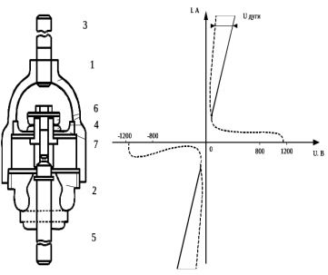 Напряжение пробоя этого искрового промежутка (800 – 1200 В) регулируется толщиной слюдяной прокладки между медными электродами, которые создают пробивной зазор. Вкладыш является основным элементом искрового промежутка. Его можно многократно менять без замены корпуса ИП. Вкладыш сконструирован таким образом, что в случае протекания через него тока короткого замыкания создается магнитное дутье. Это дутье вытесняет дуга из пробивного зазора к стенкам корпуса, что и обеспечивает многократность действия искрового промежутка. Пробивное напряжение равное 1200 В обеспечивается в случае зазора в пределах 0,1 – 0,11 мм. Такой зазор обеспечивается тремя слюдяными прокладками с толщиной 0,03 – 0,04 мм.