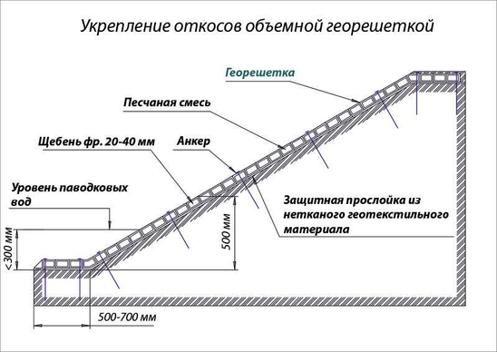 Поскольку объемная георешетка представляет собой конструкцию из множества объемных изолированных ячеек, создаются условия, препятствующие фильтрация влаги из защитного слоя в поперечном направлении, вследствие чего происходит аккумулирование влаги непосредственно в ячейках, что в свою очередь может привести к разжижению промежуточного защитного слоя и частичной потере им несущей способности.