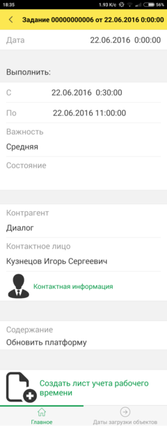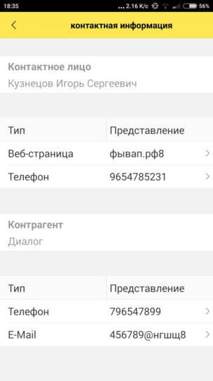 На рисунке 22 представлена форма просмотра контактной информации. На эту форму пользователь попадает из формы просмотра задания, она содержит всю контактную информацию контрагента и контактного лица, указанного в задании.