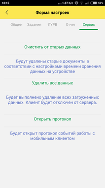 На вкладке «Сервис» пользователь может выполнить такие действия, как очистить приложение от старых данных (очистка осуществляется согласно настройкам хранения), удалить все данные (удаляются все данные с мобильного приложения, и открывается форма настройки синхронизации), открыть протокол (открывается протокол событий работы мобильного приложения).