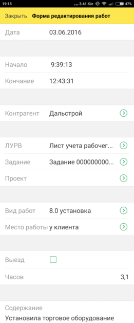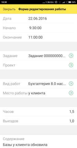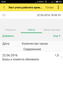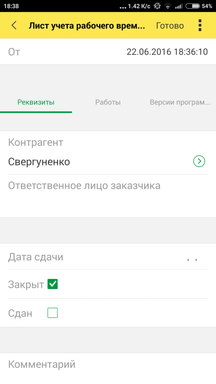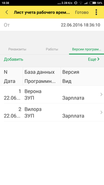 На рисунках 24, 25, 26 представлена форма для редактирования существующего или создания нового документа «Лист учета рабочего времени». Форма состоит из 3 вкладок – реквизиты, работы и версии ПП, соответственно.