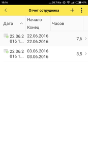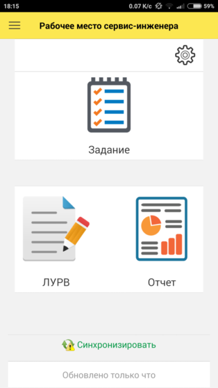 На рисунке 19 представлен рабочий стол мобильного приложения. На данную форму сервис – инженер попадает после запуска приложения. Отсюда сервис – инженер может посмотреть список полученных заданий, листов учета рабочего времени и отчетов сотрудника, а также посмотреть настройки приложения и запустить синхронизацию данных.