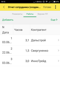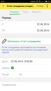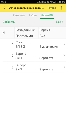 На рисунке 30, 31, 32 представлена форма для редактирования существующего или создания нового документа «Отчет сотрудника». Форма состоит из 3 вкладок – реквизиты, работы и версии ПП, соответственно.