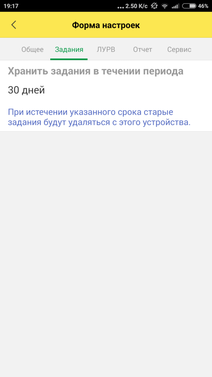 На вкладках «Задания», «ЛУРВ», «Отчет сотрудника» заполняется срок хранения соответствующих документов в мобильном приложении. По истечении этого срока данные автоматически удаляются. Значение по умолчанию – «30 дней».