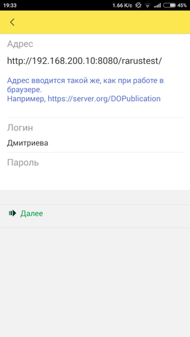 На рисунке 38 и 39представлена форма настройки подключения. На данной форме сервис – инженер может настроить доступы для синхронизации с основной учетной системой компании. Эта форма появляется при первом запуске мобильного приложения.