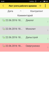На рисунке 23 представлена форма списка листов учета рабочего времени. На форме списка документов зеленым цветом подсвечиваются те документы, которые уже закрыты и сданы, красным цветом, которые не закрыты и не сданы, а серым, которые закрыты, но не сданы.