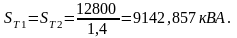 где SТ – мощность трансформатора, кВА; S – полная мощность потребителей, кВА, принимается S = 12800 кВА; КП – коэффициент перегрузки трансформатора (К = 1,4)