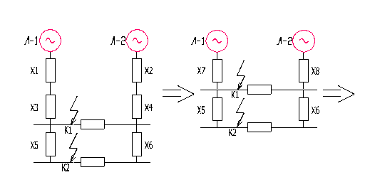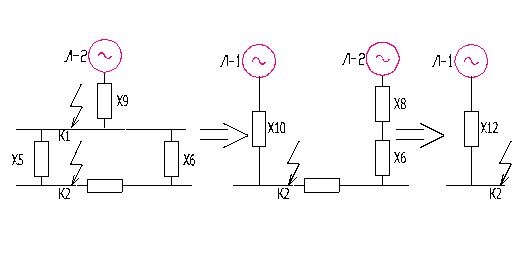 Для расчета тока короткого замыкания К2 необходимо сложить последовательно сопротивления Х7 и Х5